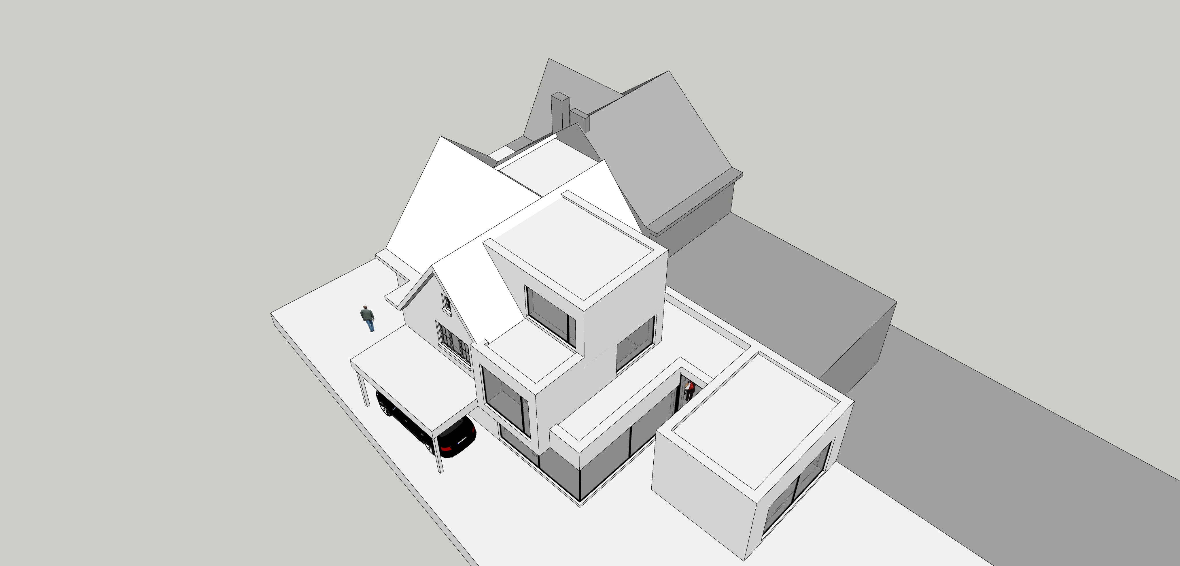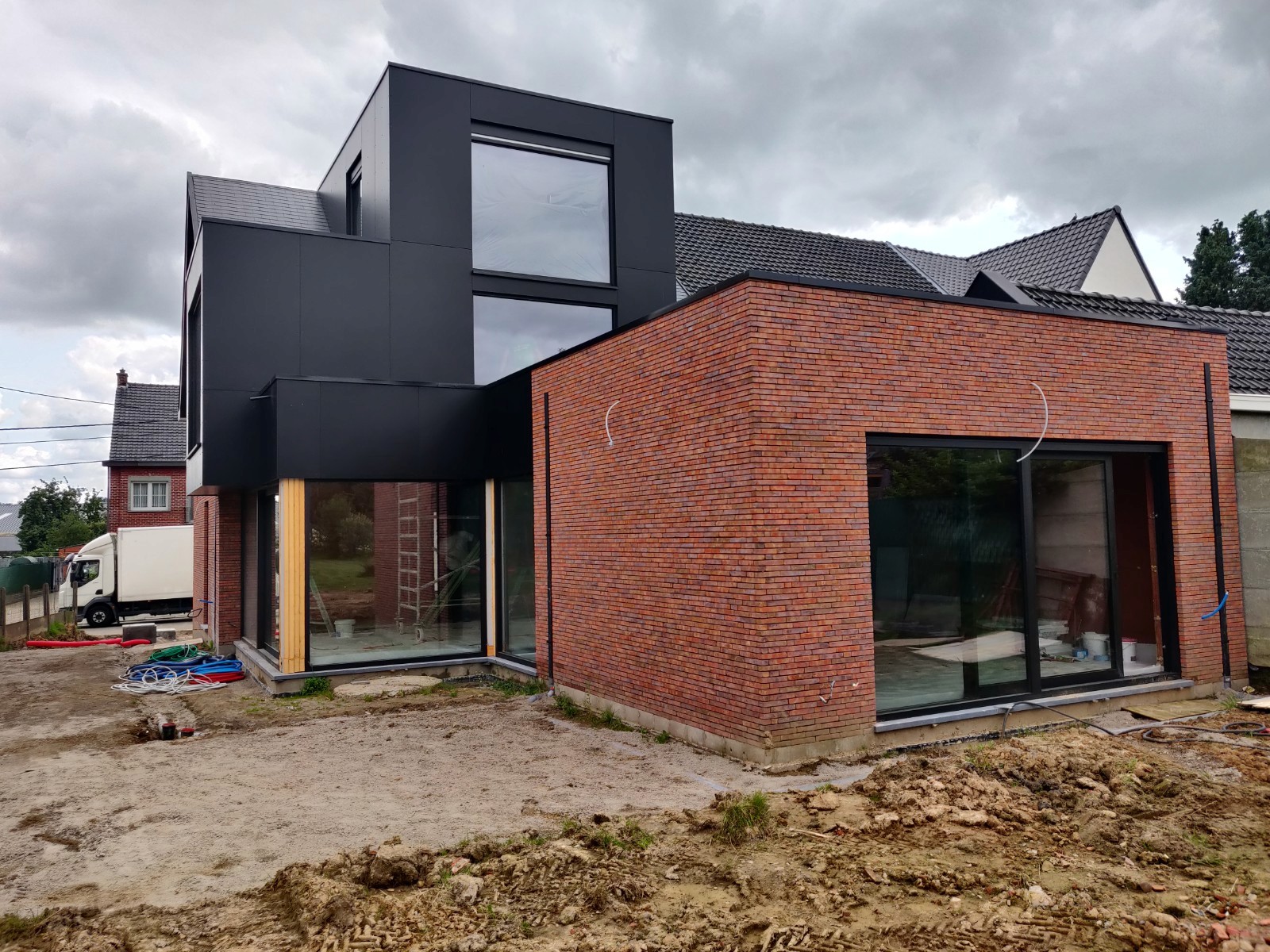 De bestaande woning werd grondig gerenoveerd en aangevuld met een aanbouw die bestaat uit een compositie van gestapelde kubussen, die voor een uitgesproken contrast zorgen met de traditionele dakvorm van de bestaande woning.