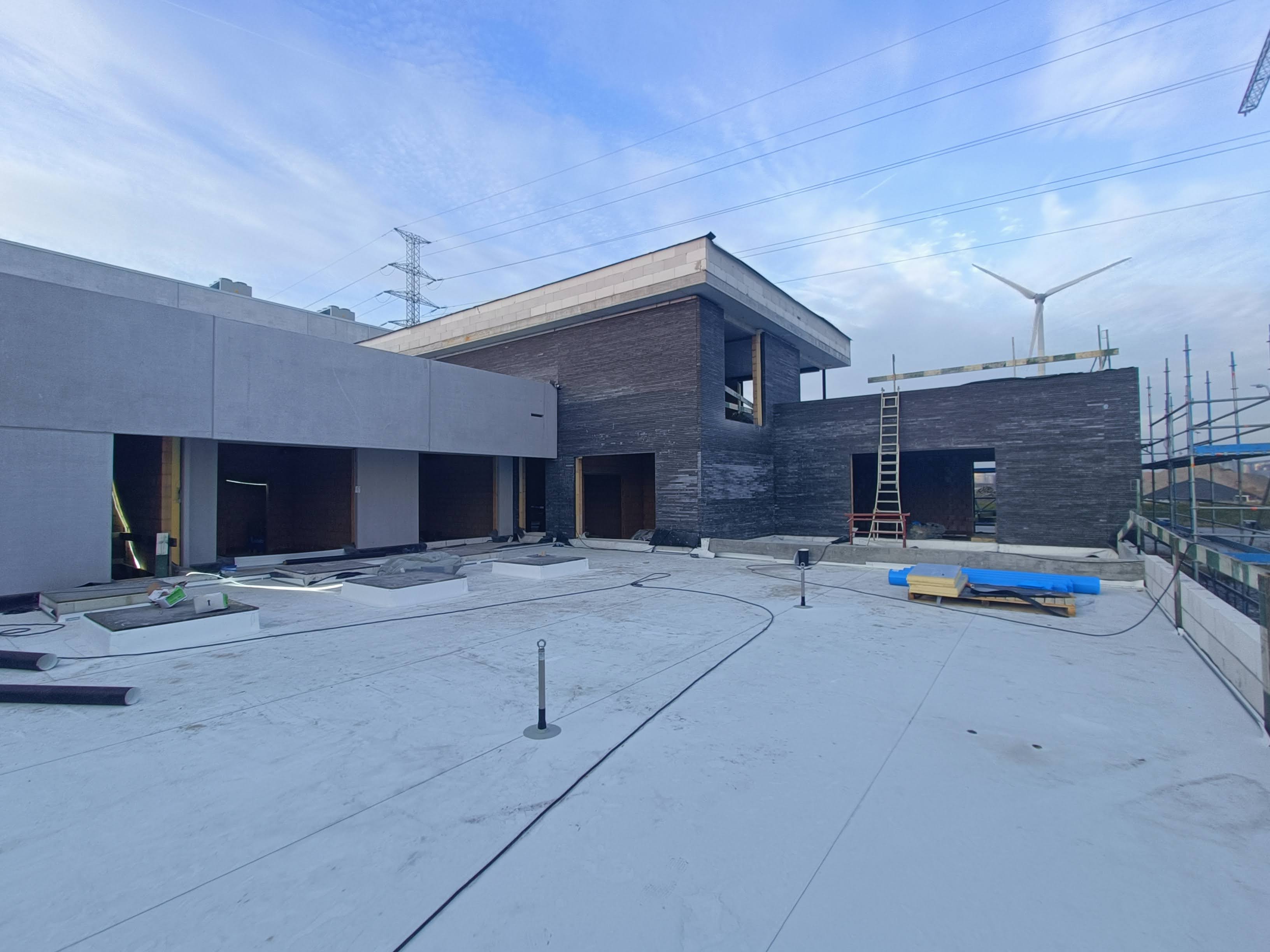 Groene accenten verzachten het industriële karakter en versterken de harmonie tussen gebouw en omgeving.