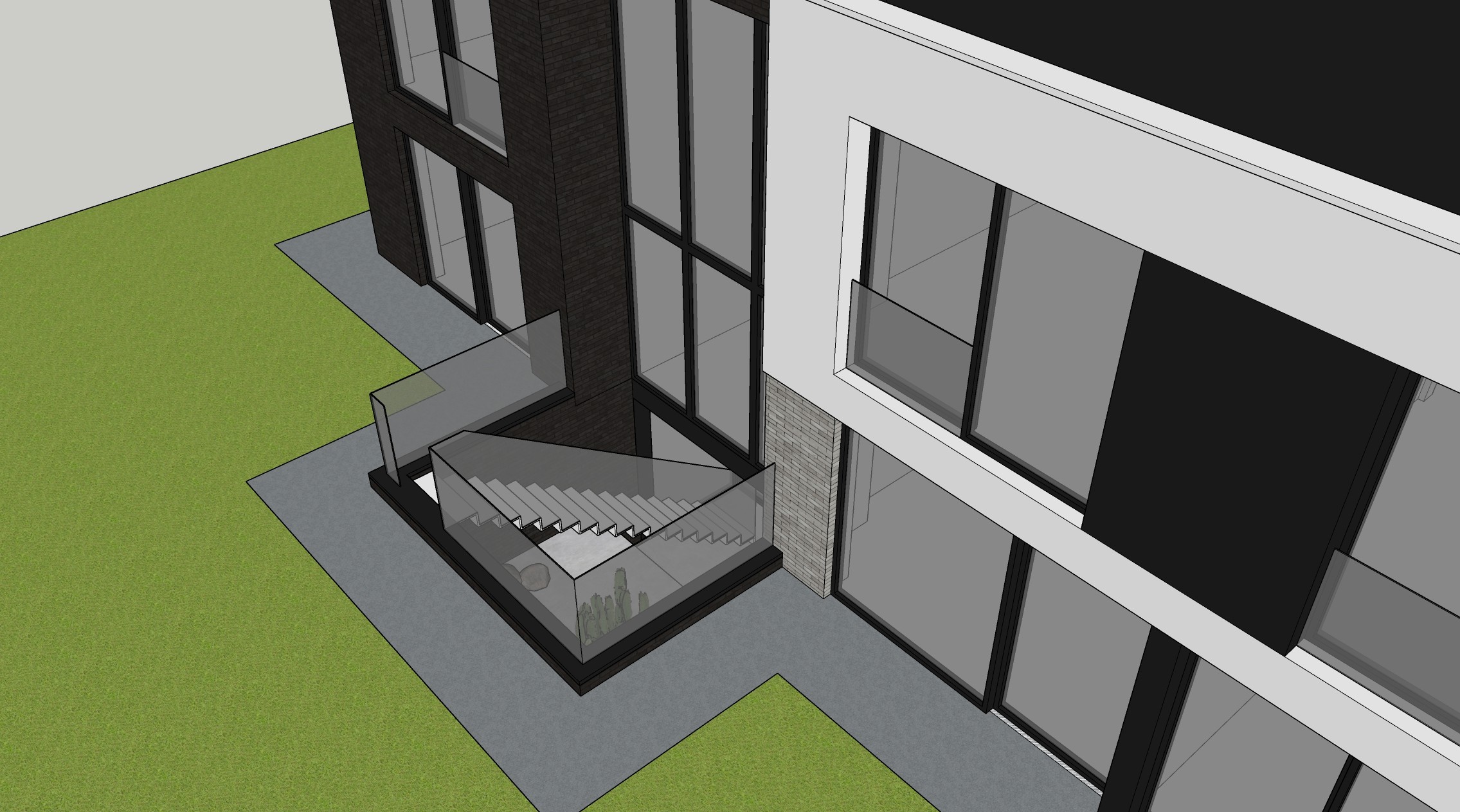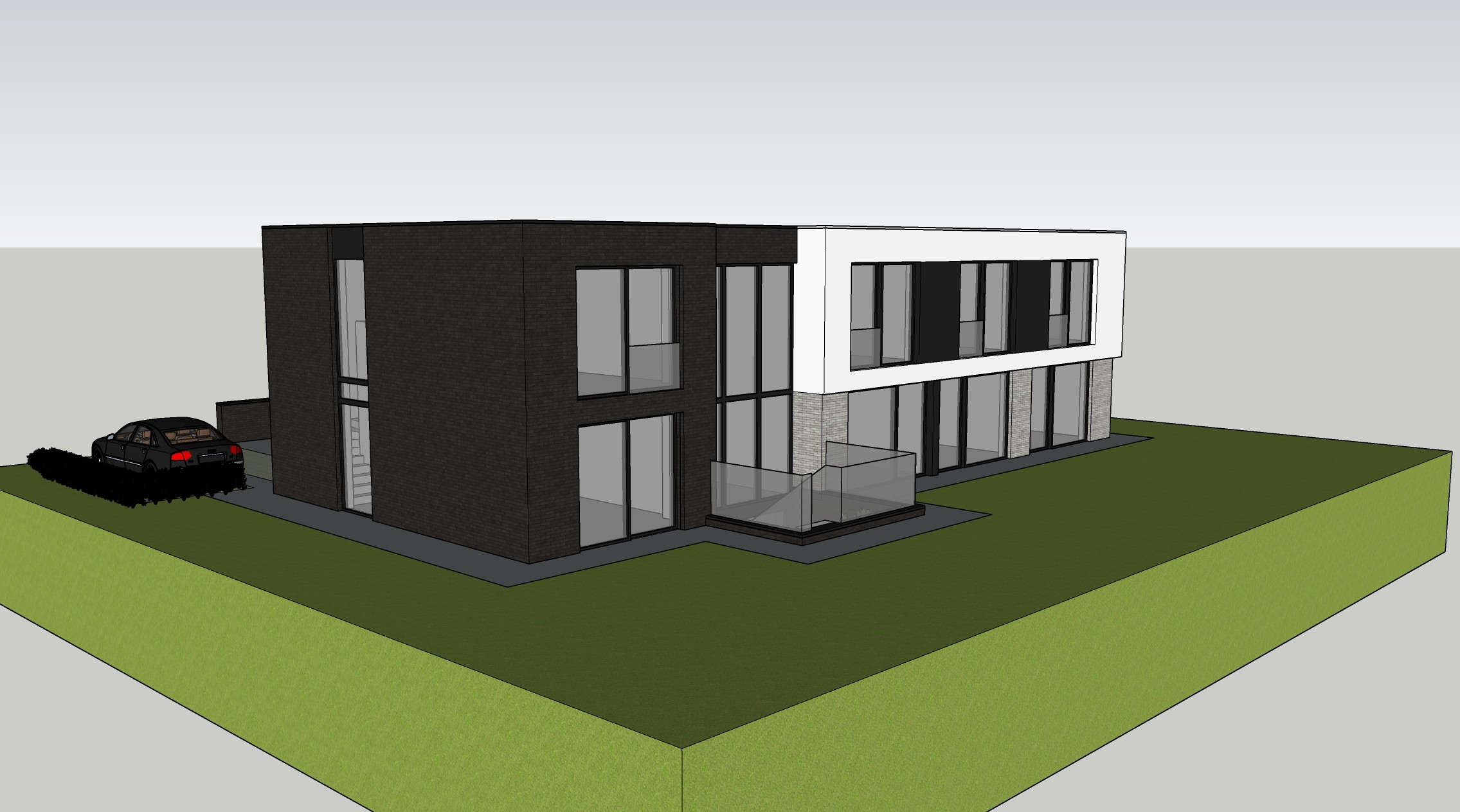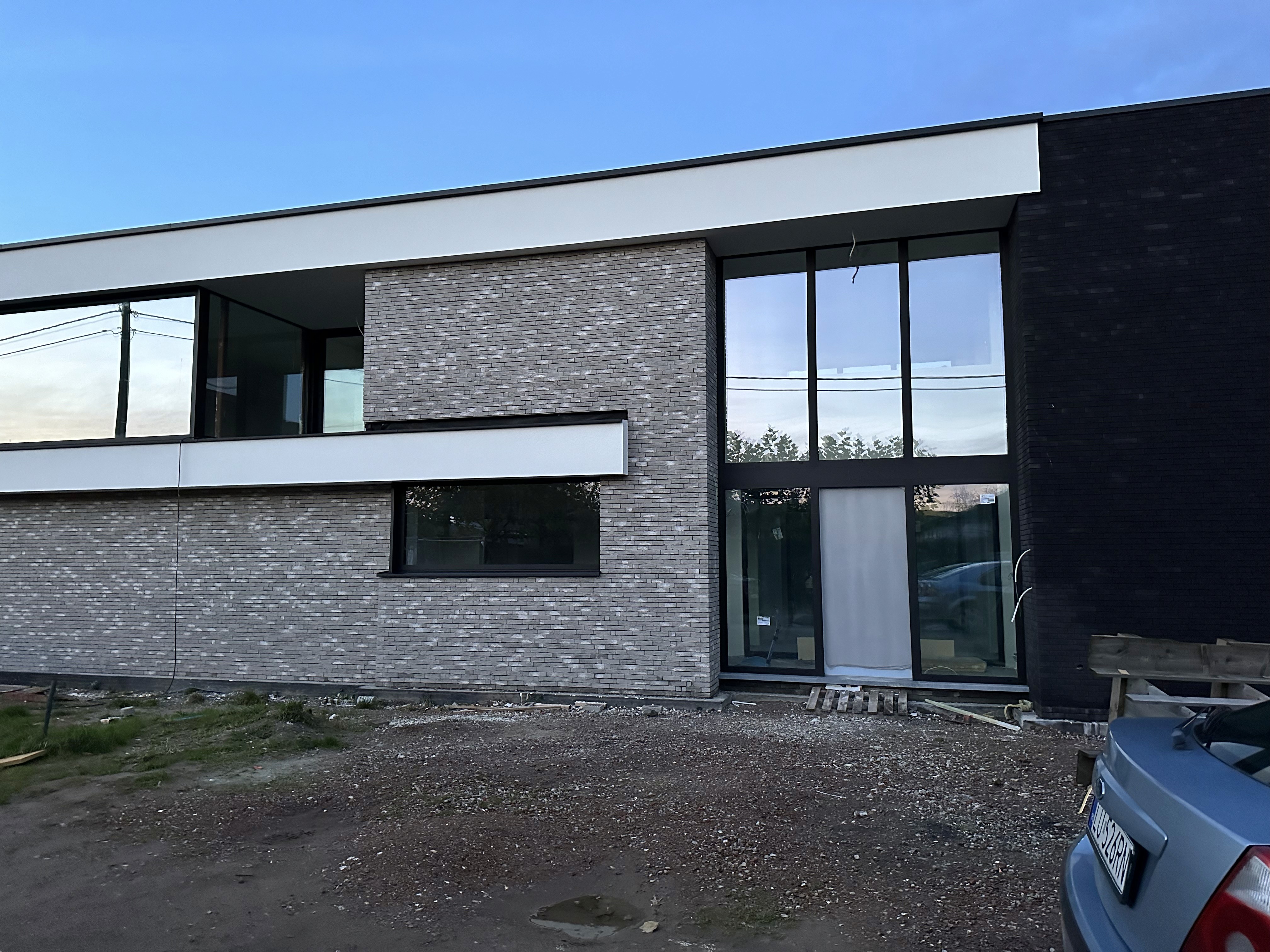 De glaspartijen zorgen voor veel natuurlijk licht in de praktijkruimtes, terwijl het donkere metselwerk en de witte accenten in pleisterwerk zorgen voor een krachtig visueel contrast.