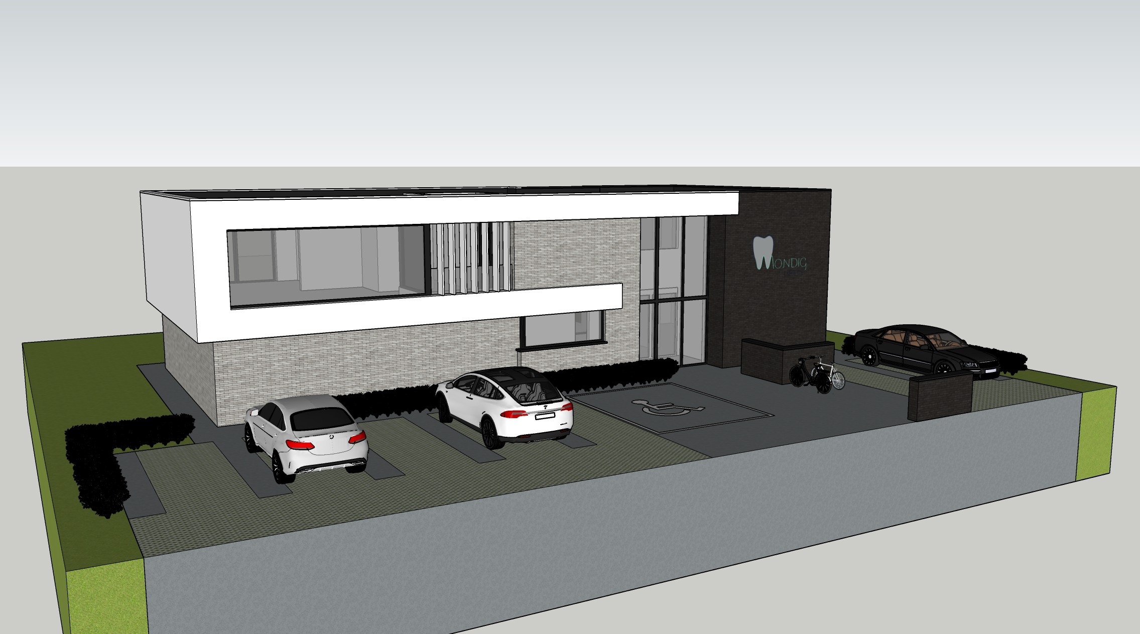 Deze strakke en moderne nieuwbouw herbergt een tandartspraktijk met een ondergrondse polyvalente ruimte.