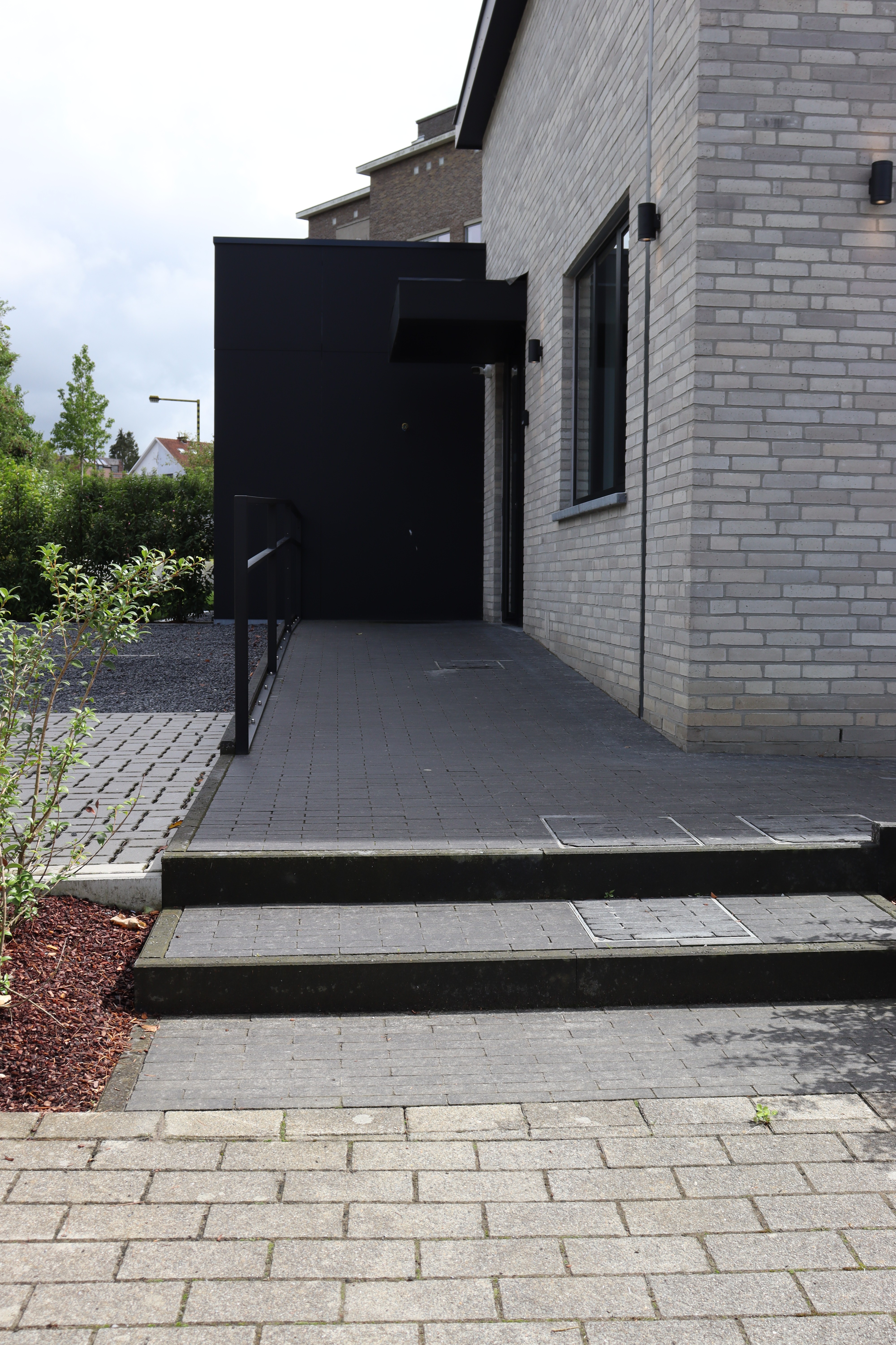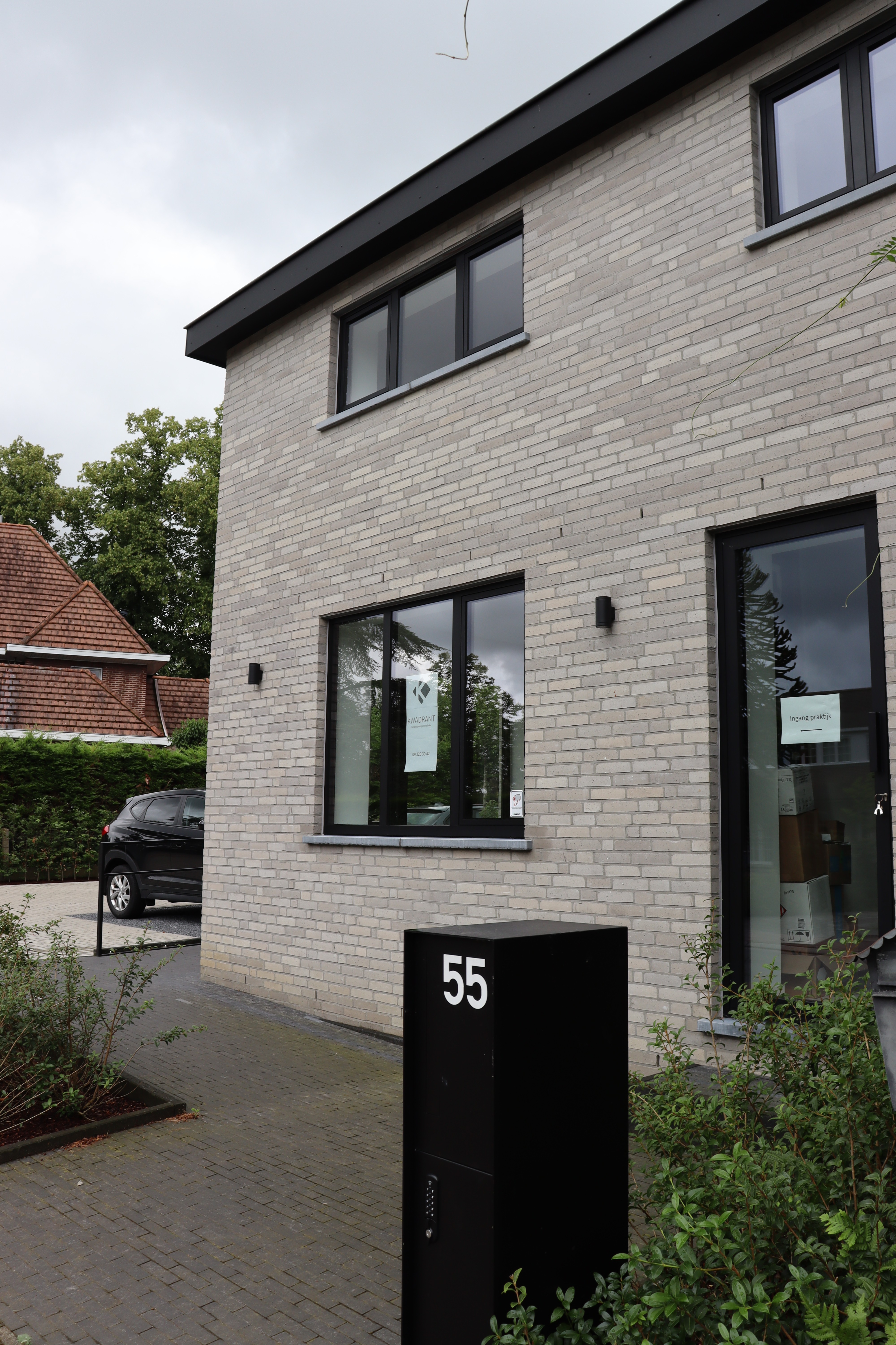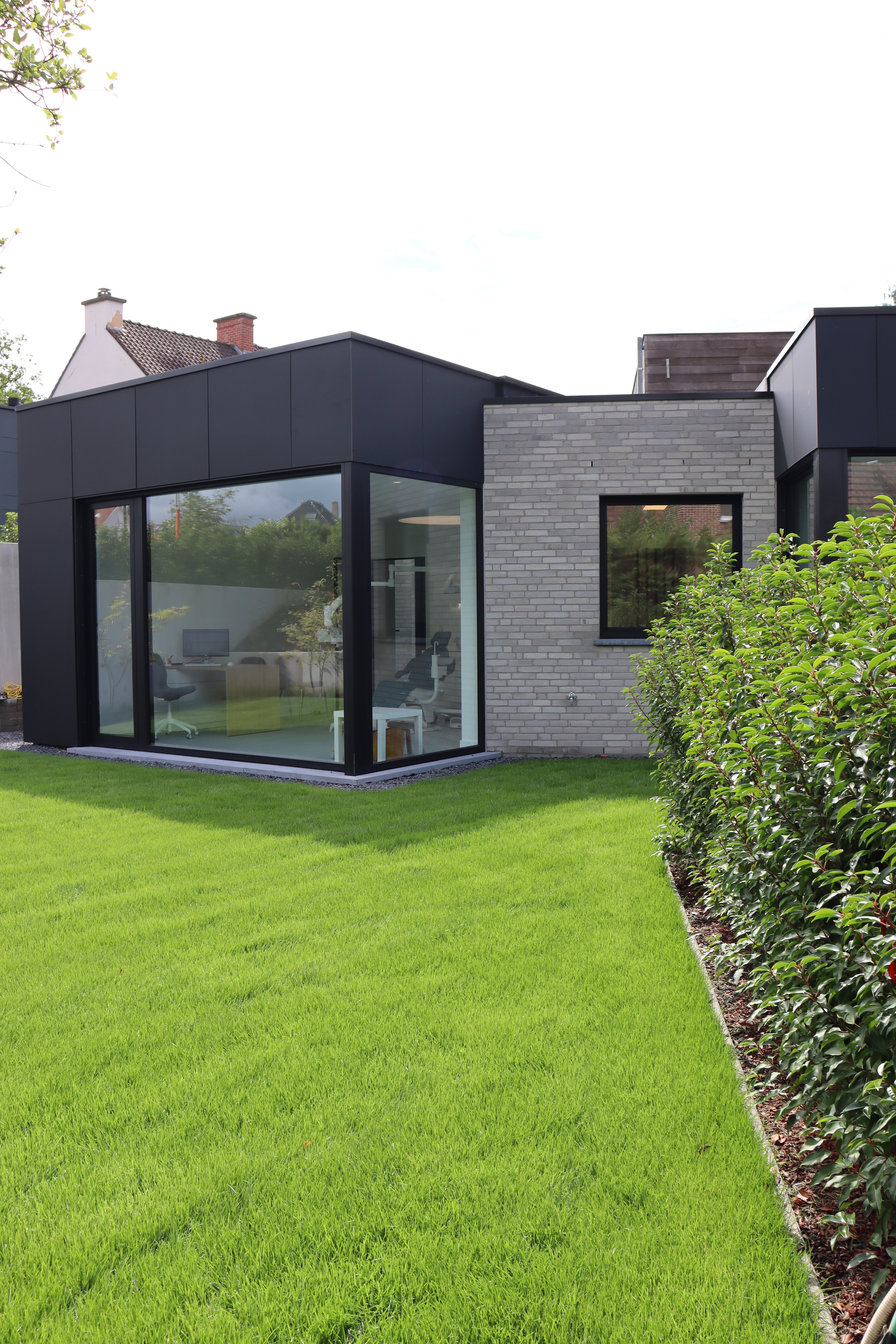 Een bestaande gezinswoning, gevestigd in een sobere woning, heeft een opvallende uitbreiding ondergaan en doet nu dienst als tandartspraktijk.