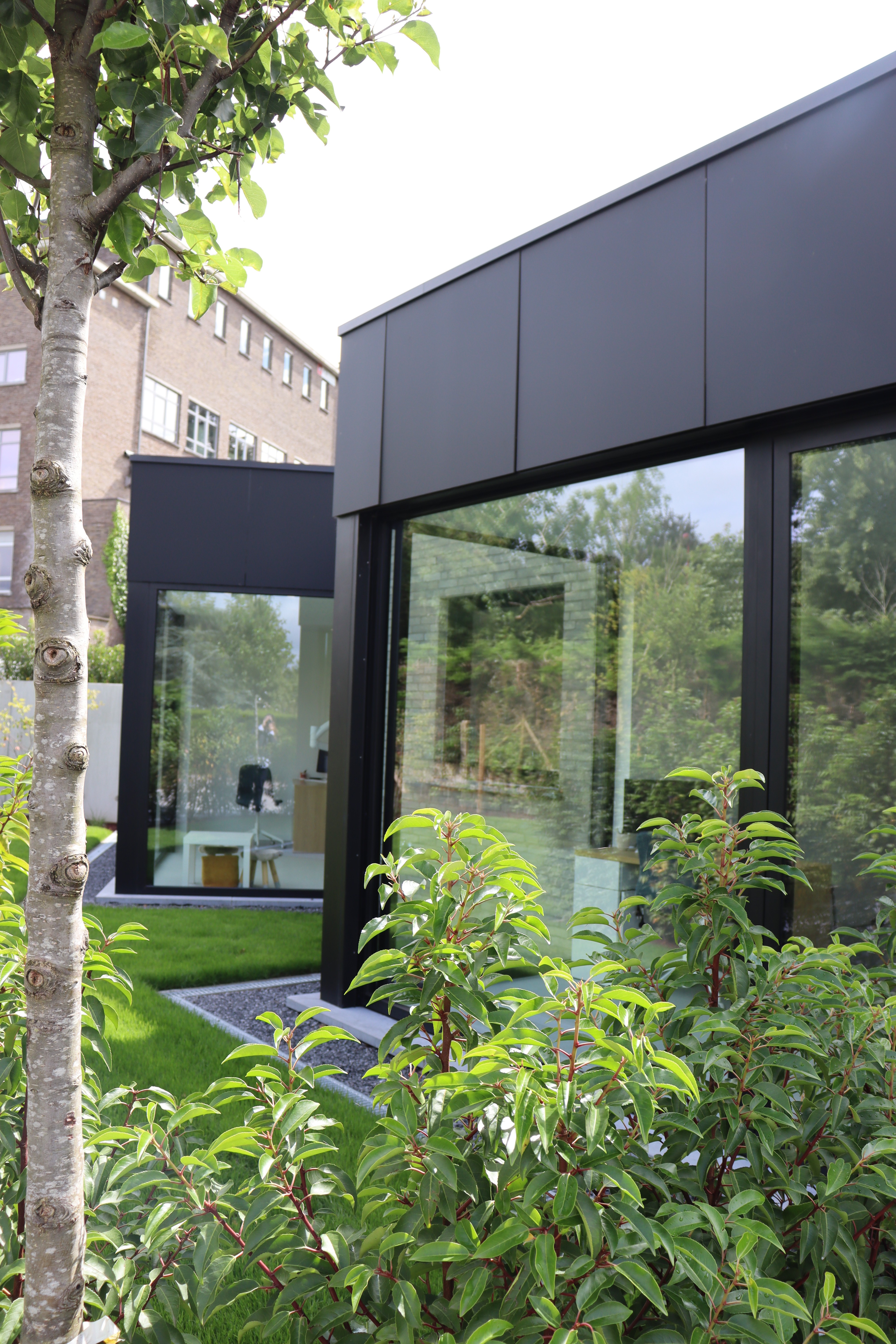 Waar het oorspronkelijke gebouw eerder sober oogt, zorgen twee nieuw toegevoegde, zwarte kubusvormige volumes voor een krachtig contrast.