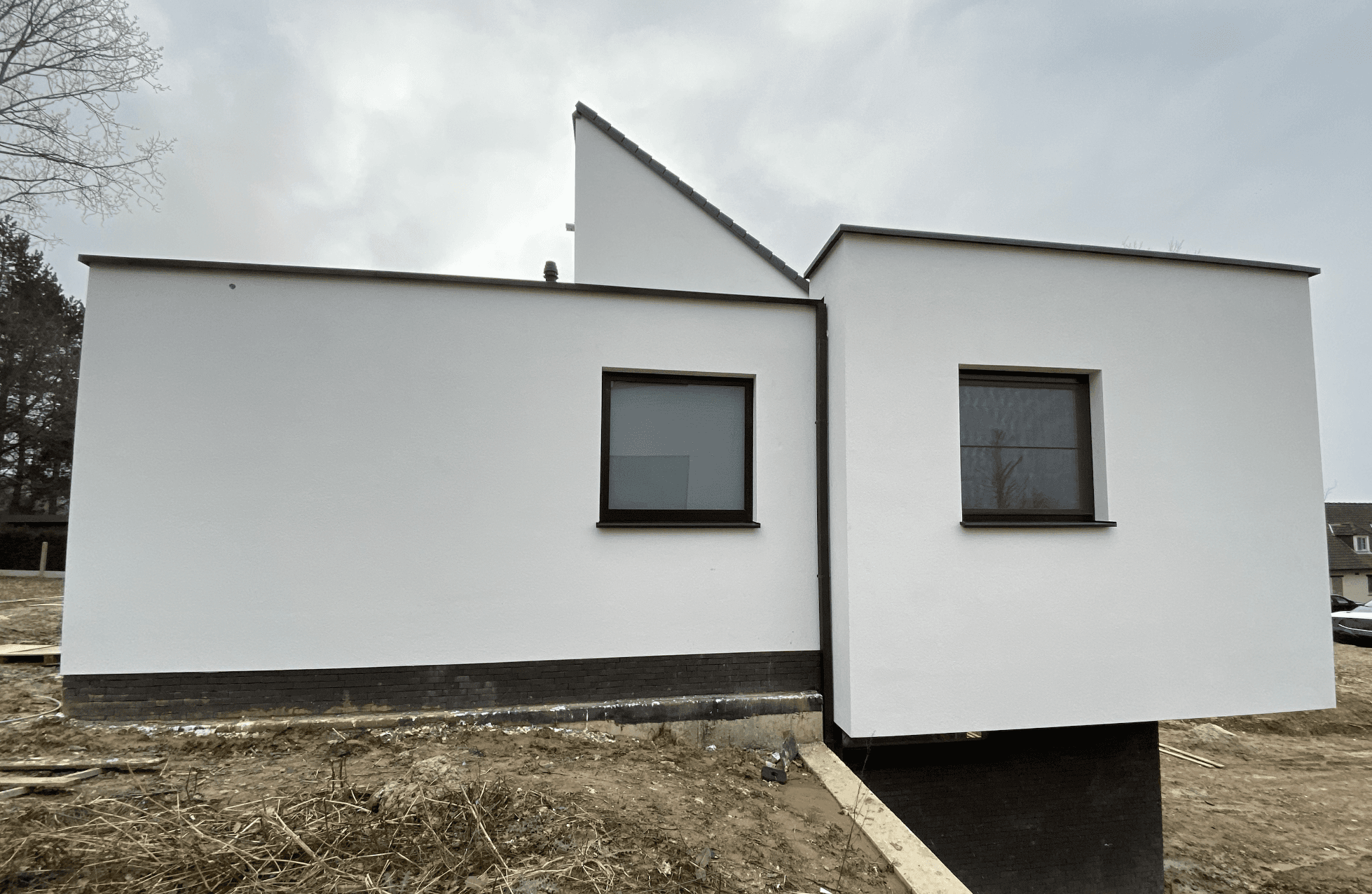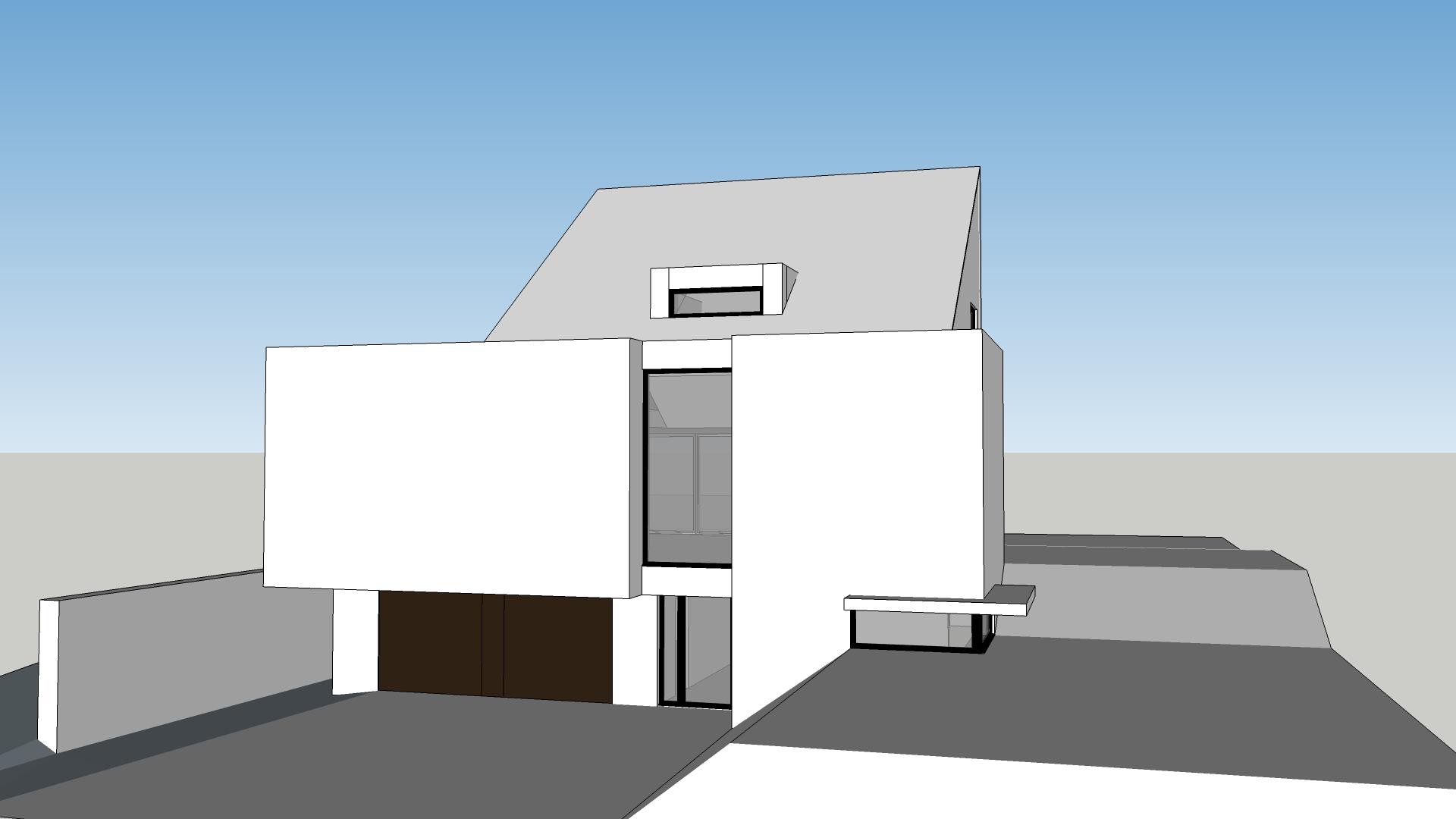 Een ééngezinswoning die zich kenmerkt door een strakke en gesloten voorgevel die de privacy garandeert maakt van dit huis een architecturaal statement. Achter deze sobere gevel ontvouwt zich een dynamisch spel van hellende daken en vormen met een royale raampartij met zicht op het achterliggende landschap.